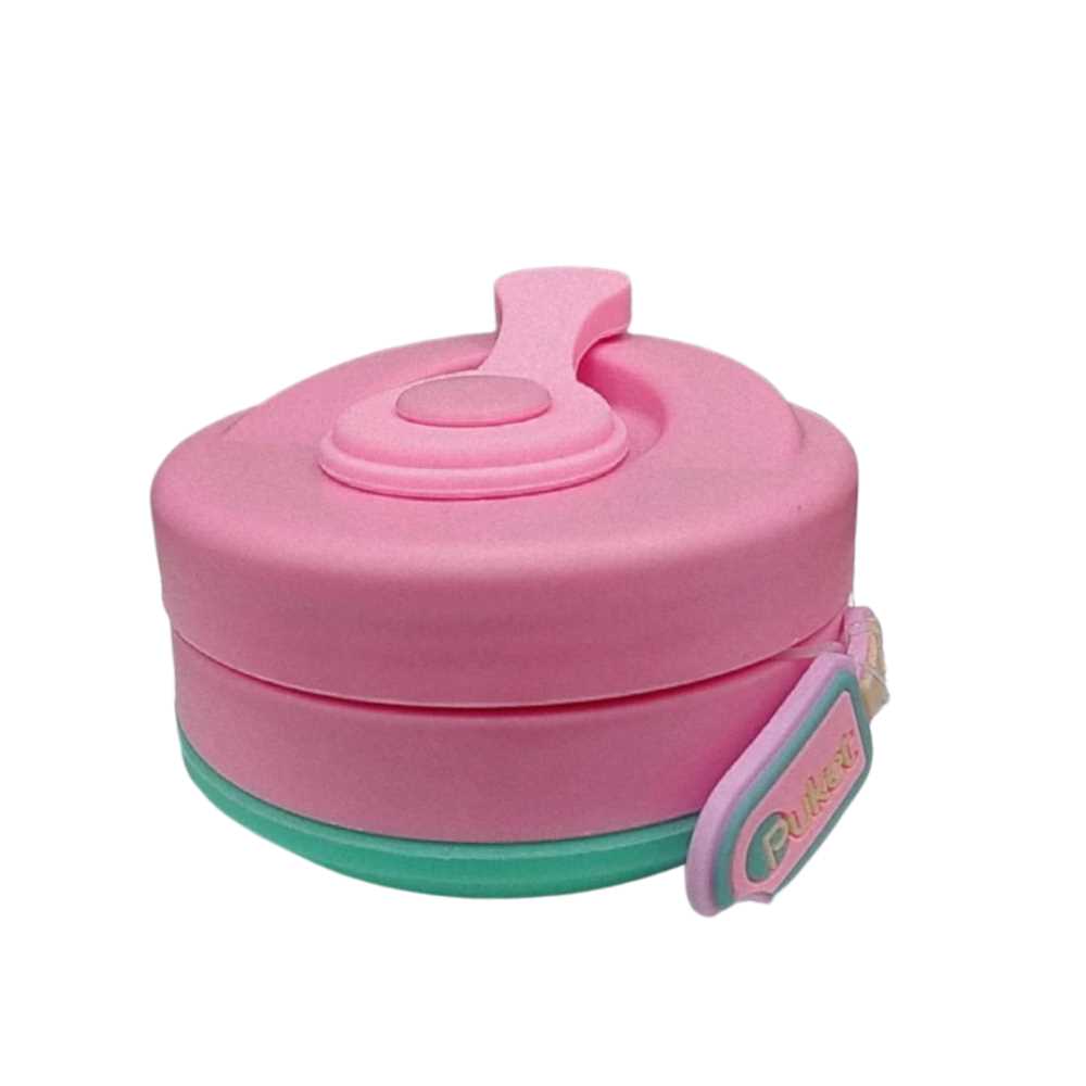 Copo em silicone. Possui forma retrátil (menor quando vazia), tampa de rosquear com bico embutido e aplique emborrachado.