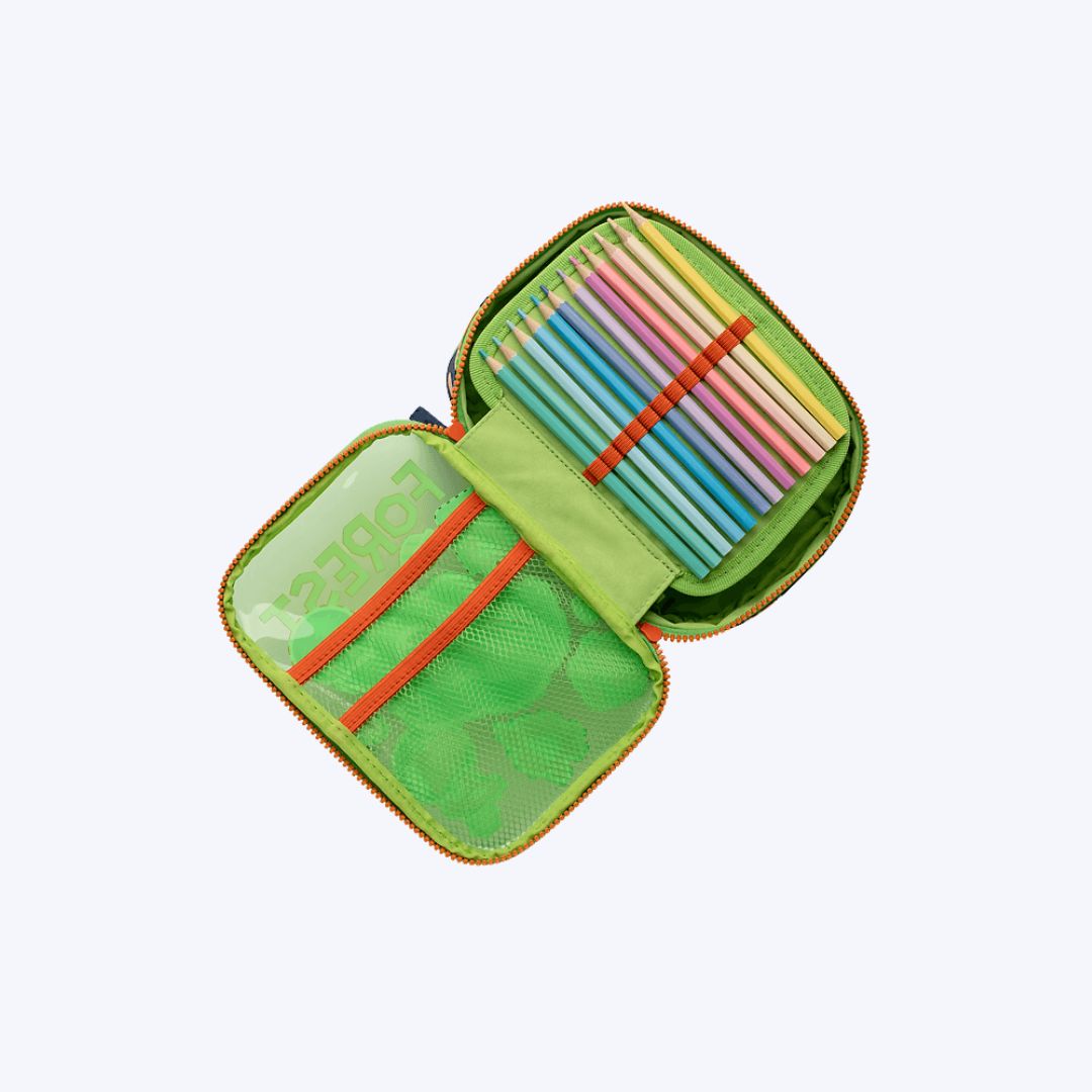 A parte frontal conta com estampa localizada de dragão em PVC transparente, garantindo um toque moderno e resistente. O interior é funcional, com aba organizadora com 24 elásticos para lápis e canetas, além de dois bolsos em telinha para guardar pequenos objetos com fácil visualização.