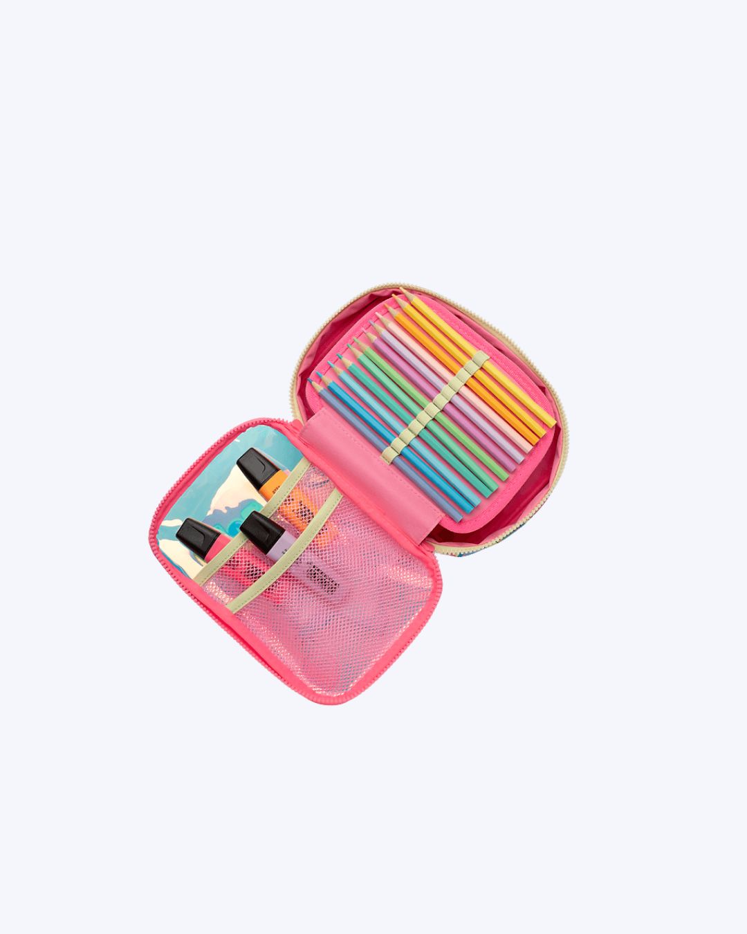 Compartimentos: 1 compartimento principal. Parte interna com 2 bolsos em tela e 24 elásticos para armazenamento de lápis.