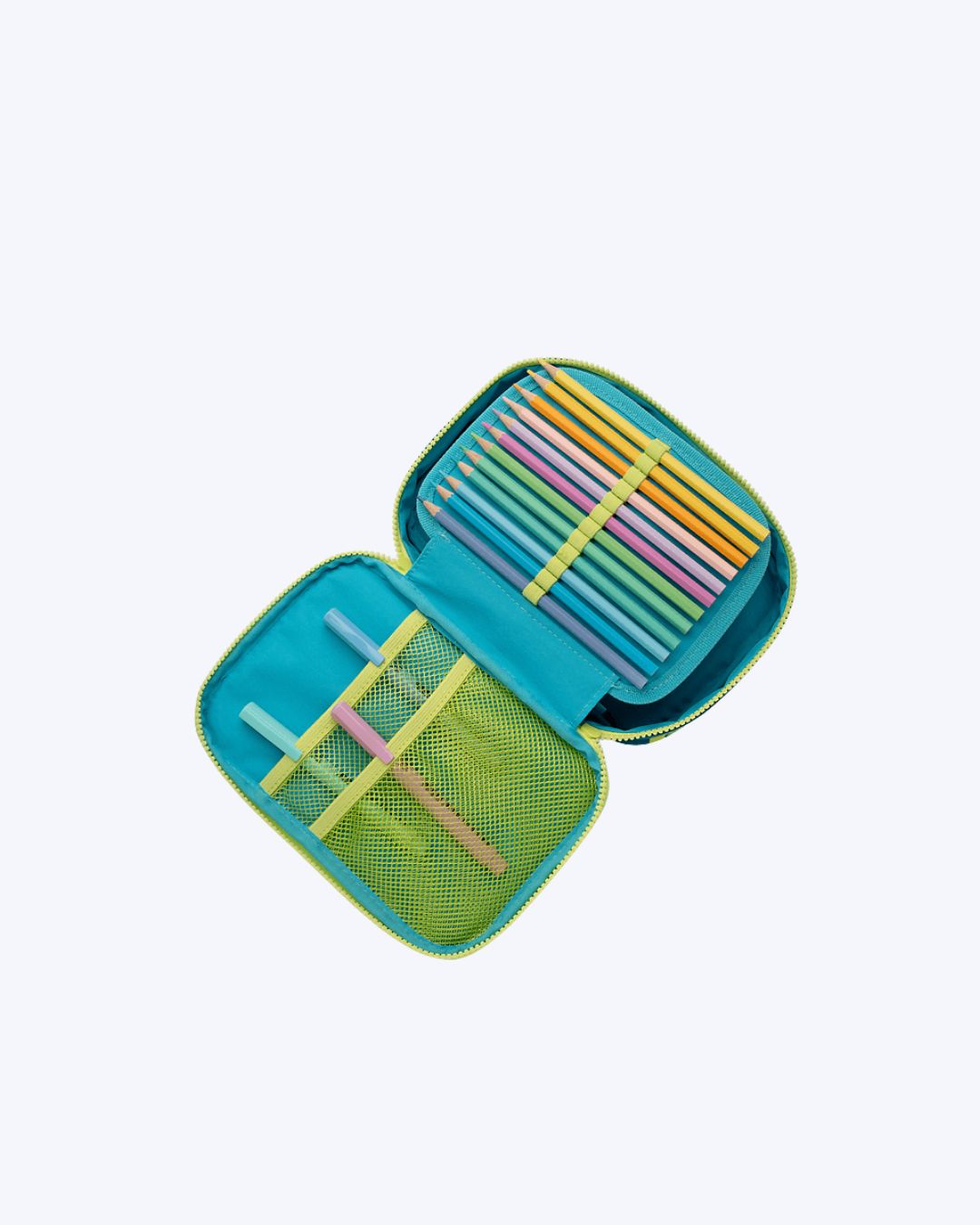 Compartimentos: 1 compartimento principal. Parte interna com 2 bolsos em tela e 24 elásticos para armazenamento de lápis.