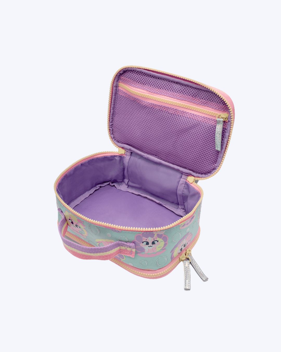 Estojo grande em nylon, parte frontal em PU fosco estampa localizada de Gata sereia, parte traseira com paetê reversível.