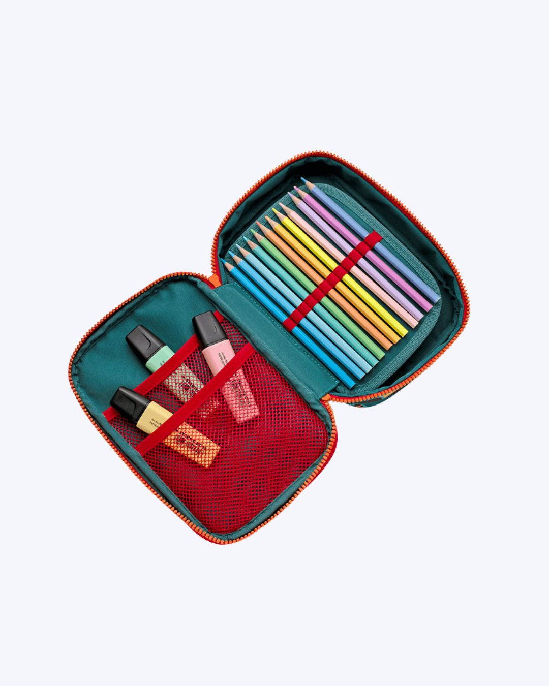 Possui aba interna com 24 elásticos para armazenamento de lápis.