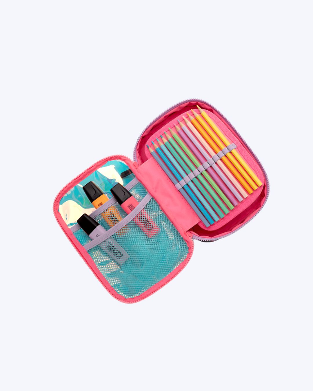 Compartimentos: 1 compartimento principal. Parte interna com 2 bolsos em tela e 24 elásticos para armazenamento de lápis.