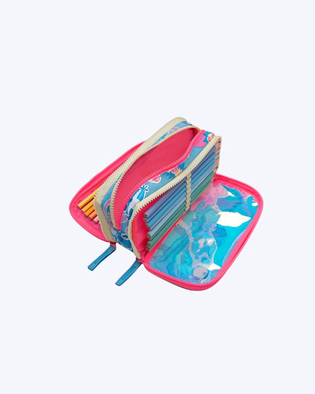 Estojo triplo, parte frontal em TPU holográfico com estampa do Stitch. Possui 3 compartimentos, ideal para organização dos seus itens. Tamanho: Único Medidas: 21 cm x 10 cm x 7 cm (LxAxP) Cor: Azul céu Indicado para: Crianças / adolescentes / adultos Ocasião: Escolar / trabalho Material externo/interno: Poliéster (nylon) Fechamento: Com zíper Capacidade: 800 ml Compartimentos: 3 compartimentos
