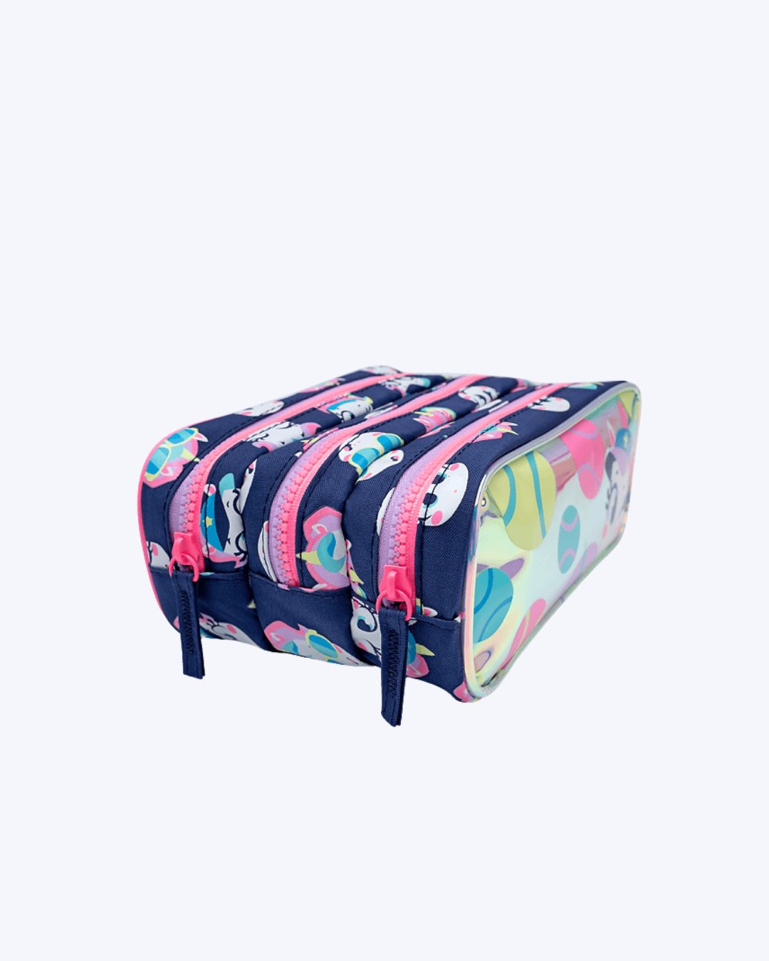 Estojo triplo, parte frontal em TPU holográfico com estampa de unicórnio. Possui 3 compartimentos, ideal para organização dos seus itens. Tamanho: Único Medidas: 21 cm x 8,5 cm x 13 cm (LxAxP) Cor: Marinho Indicado para: Crianças / adolescentes / adultos Ocasião: Escolar / trabalho Material externo/interno: Poliéster (nylon) Fechamento: Com zíper Capacidade: 800 ml Compartimentos: 3 compartimentos