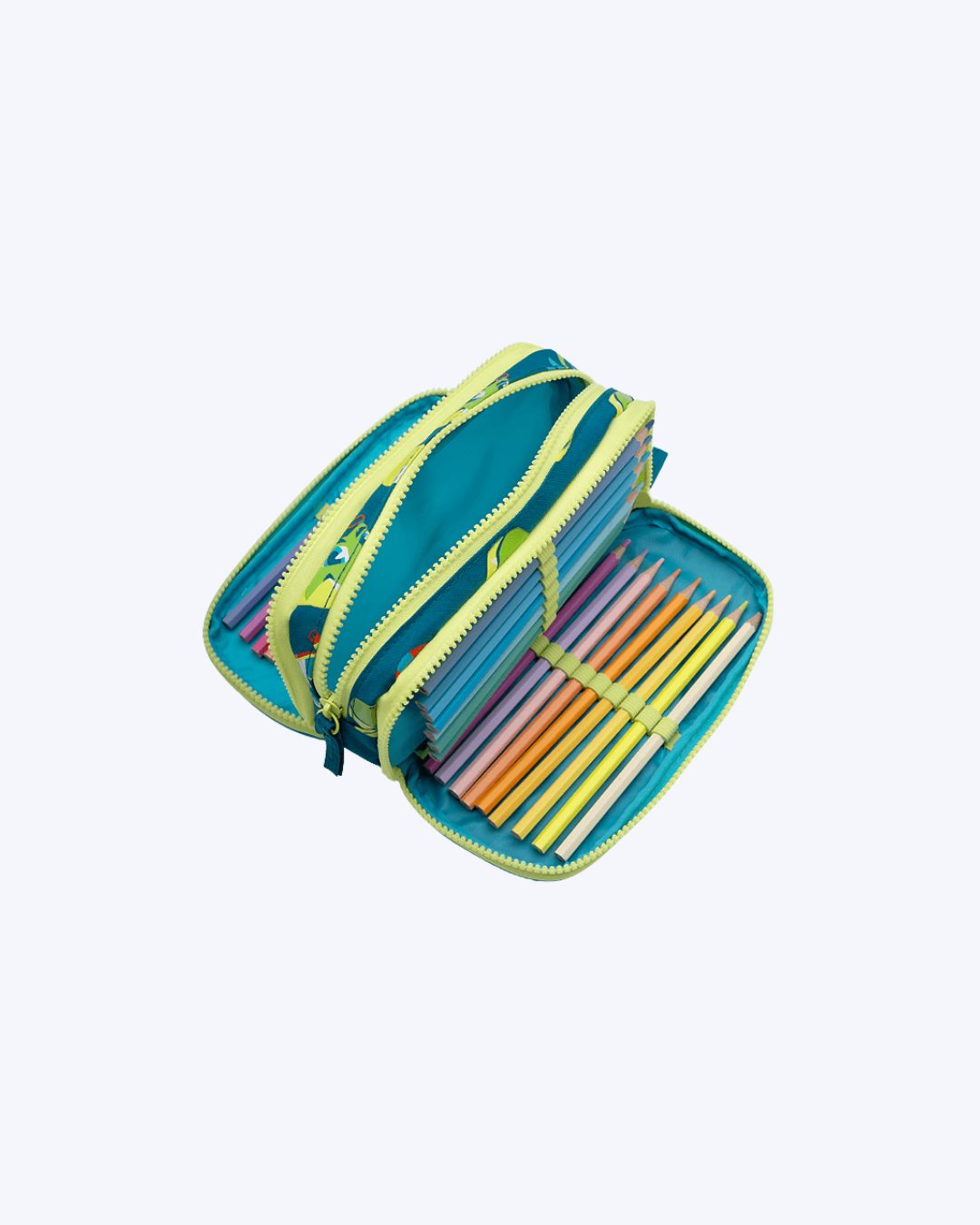 Estojo tripo, parte frontal em PU fosco com estampa de Jacaré. Possui 3 compartimentos, ideal para organização dos seus itens. Tamanho: Único Medidas: 21 cm x 10 cm x 7 cm (LxAxP) Cor: Azul Petroleo Indicado para: Crianças / adolescentes / adultos Ocasião: Escolar / trabalho Material externo/interno: Poliéster (nylon) Fechamento: Com zíper Capacidade: 800 ml Compartimentos: 3 compartimentos
