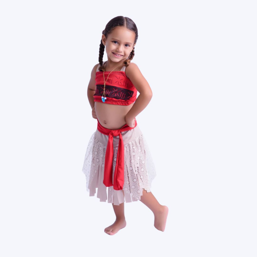Deixe sua pequena viver a magia da Moana com esta encantadora Fantasia da Muvile! Inspirada na corajosa e aventureira princesa do Pacífico, essa fantasia traz toda a beleza e personalidade do personagem. O conjunto é composto por um top de alcinha em helanca, um tecido macio e com elasticidade, que proporciona conforto e liberdade para se mover. O top é adornado com uma estampa tribal na parte da frente, que remete à cultura polinésia, e a saia é feita com franjas e renda delicada, dando um toque ainda mais especial ao look.