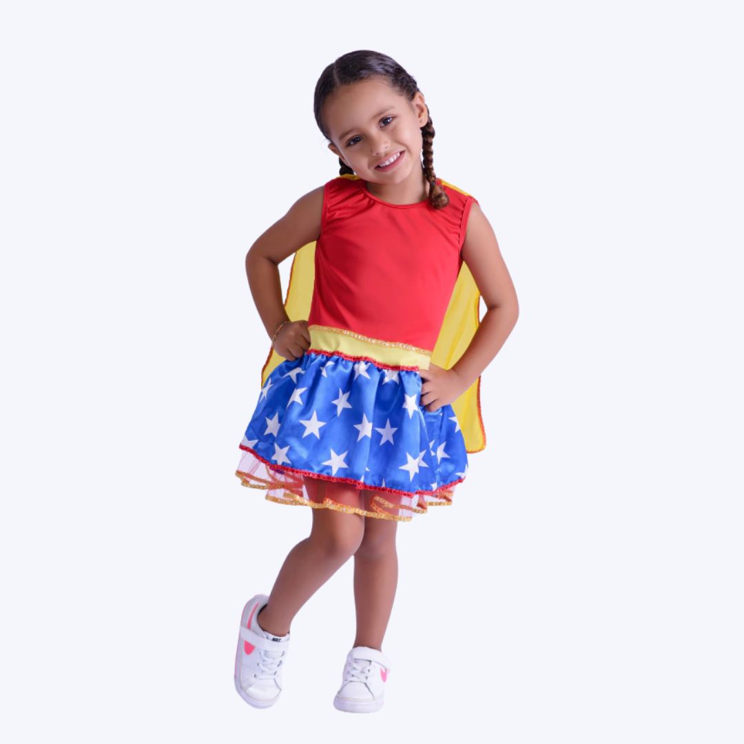 A Fantasia Mulher Maravilha da Muvile é a escolha perfeita para as pequenas que querem se transformar em verdadeiras heroínas! Esta fantasia incrível é composta por um vestido deslumbrante, com a parte de cima vermelha, que traz todo o charme e poder da Mulher Maravilha, enquanto a saia azul, estampada com estrelas douradas, remete ao icônico visual da super-heroína. Para completar o look, a capa amarela adiciona um toque extra de força e estilo, fazendo com que sua filha se sinta pronta para salvar o mundo!