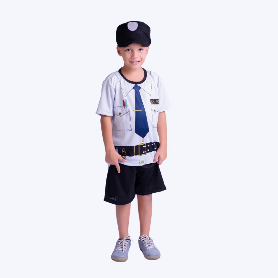 O look é finalizado com um chapéu de policial, proporcionando um toque especial para que seu filho se sinta pronto para cumprir a missão e fazer justiça onde quer que vá.