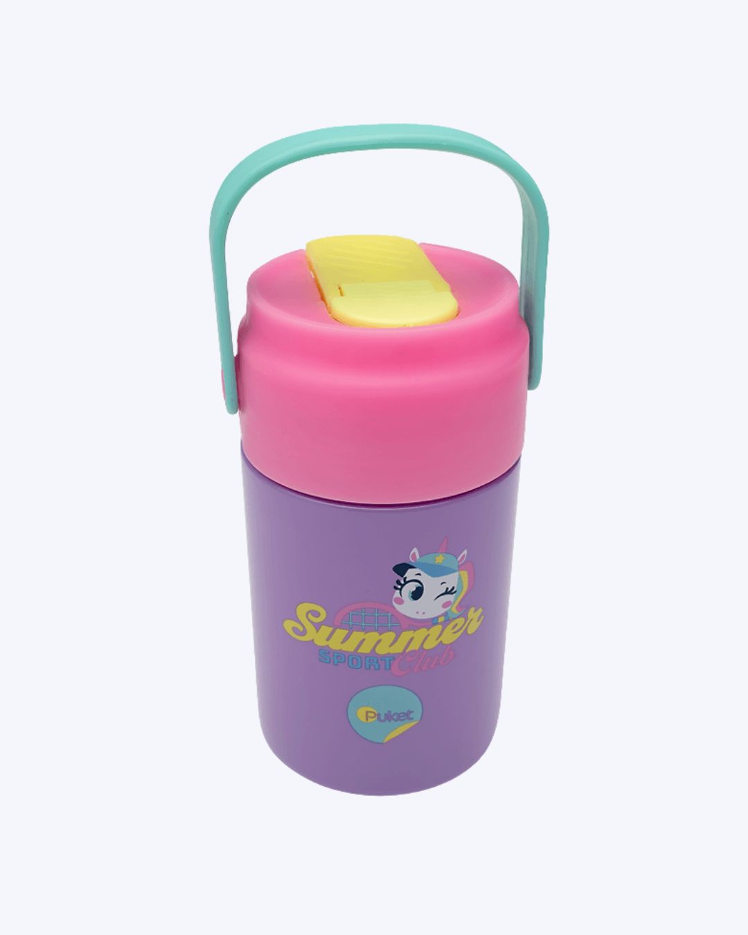 A garrafinha térmica em aço inox com estampa de unicórnio possui tampa de rosquear com bico retrátil de plástico.