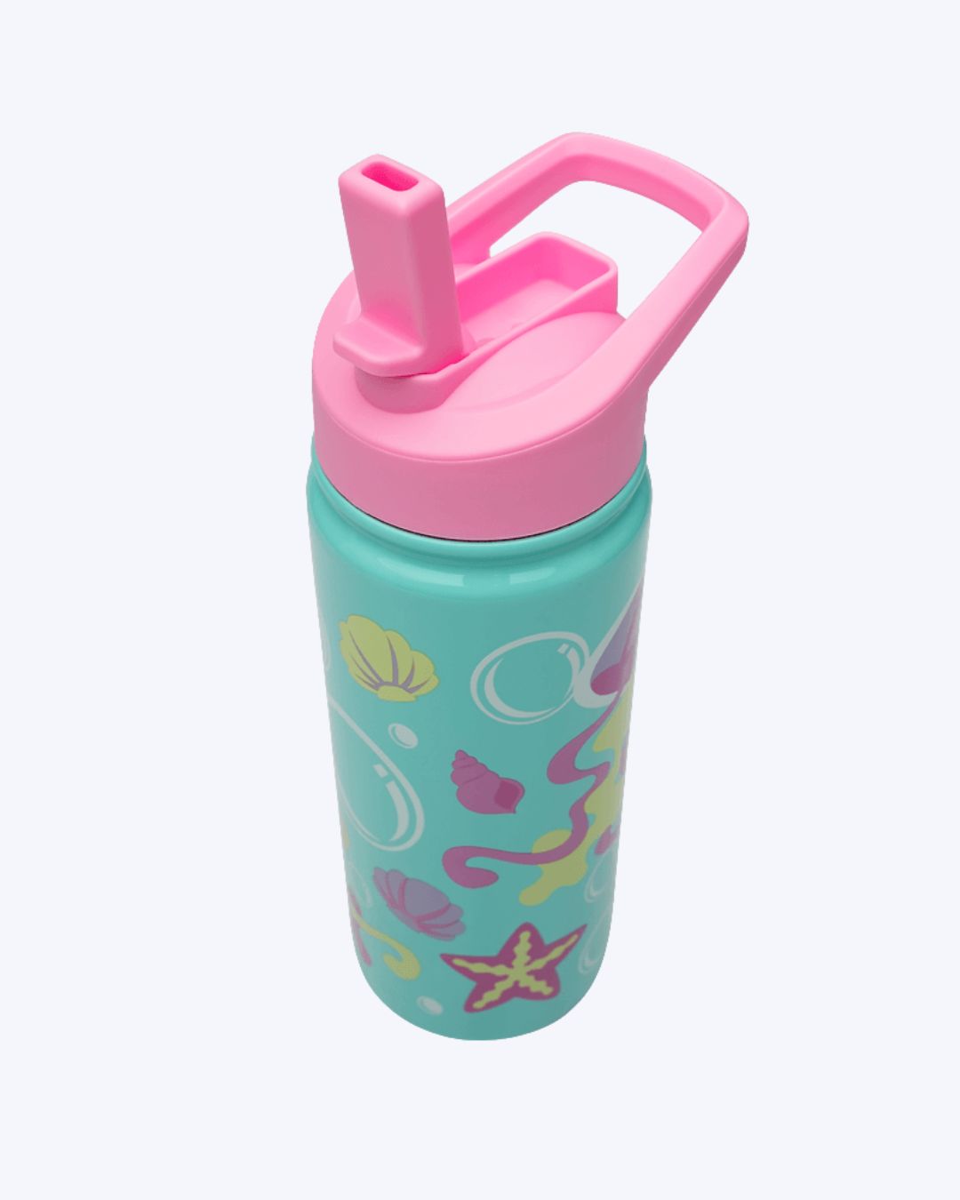 A garrafinha térmica em aço inox com estampa de Gata Sereia possui tampa de rosquear com bico retrátil de plástico.