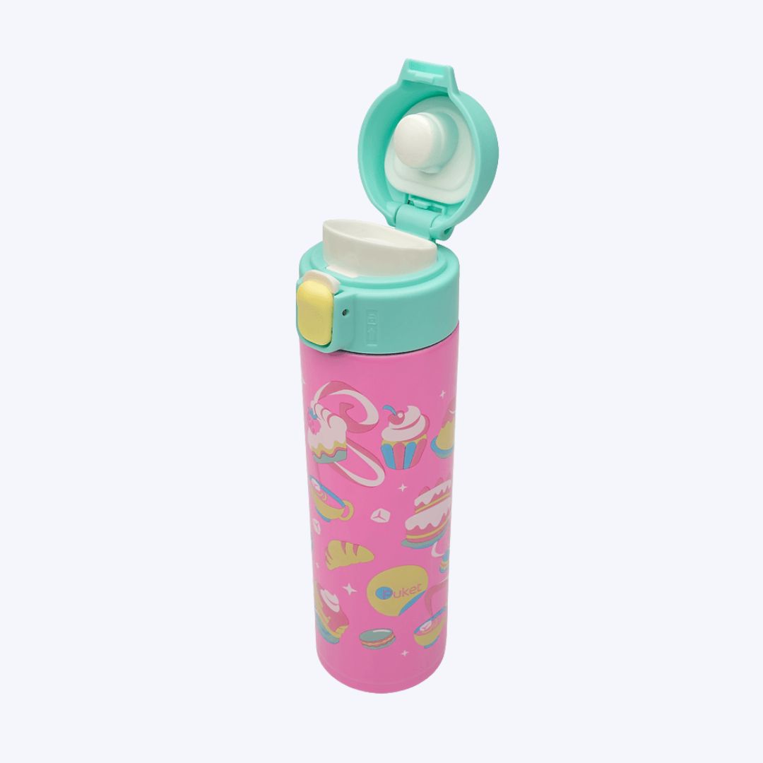 Adicione um toque doce e encantador à sua rotina com a Garrafa Térmica Rosa Raposa Confeiteira da Puket! Com estampa exclusiva da coleção Confeitaria Mágica, essa garrafinha une charme e funcionalidade em um só produto. Produzida em aço inoxidável de alta qualidade e 100% livre de BPA, ela é ideal para manter bebidas como água, sucos ou chocolate quente na temperatura ideal por mais tempo. Com capacidade de 420ml, possui dupla tampa: a externa é de rosquear e a interna tem sistema de botão com vedação a vácuo, garantindo segurança total contra vazamentos.