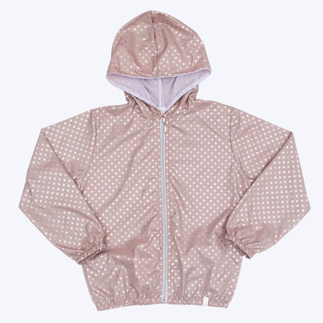 Destacando-se pela estampa de brilhos pratas que adiciona um toque de glamour, esta jaqueta é perfeita para qualquer ocasião casual. O capuz, com forro em redinha, não só complementa o visual, mas também oferece uma camada adicional de proteção nos dias mais frescos.