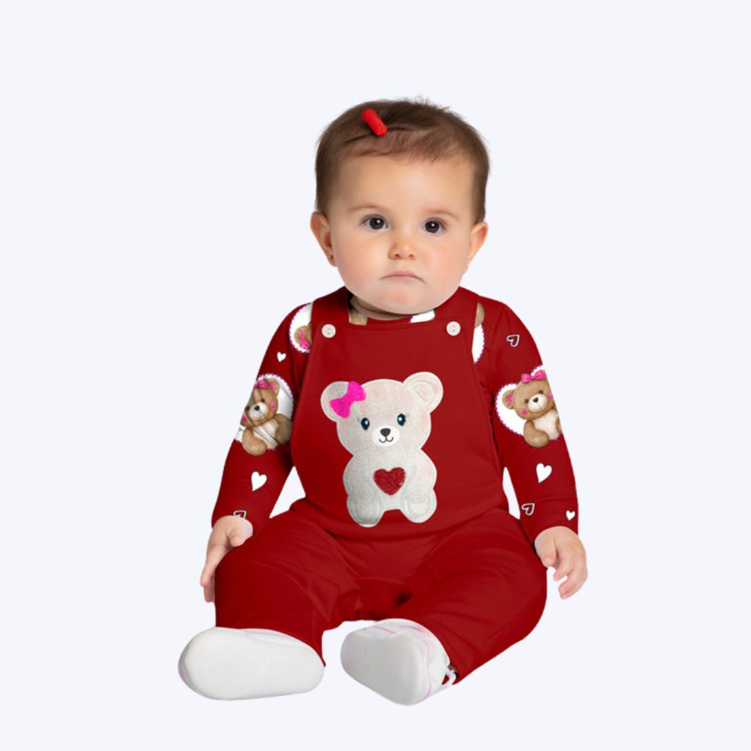 Jardineira com Body Manga Longa Ursinho Bebê Menina Kyly