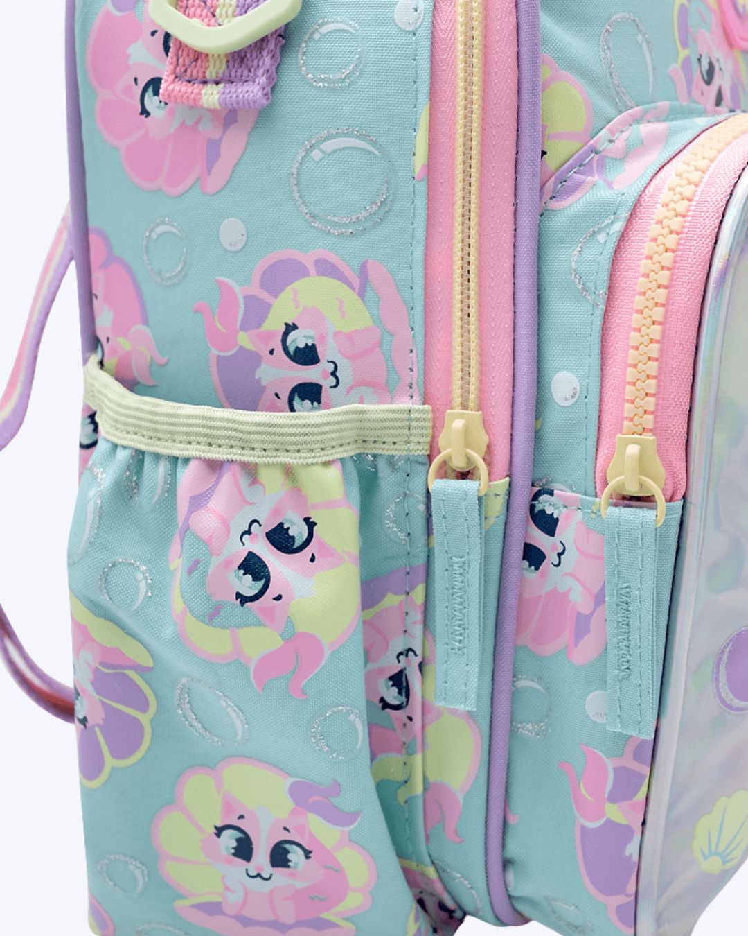 Lancheira em nylon, sem gel, com forro térmico e estampa corrida de Gata Sereia. Possui bolso frontal médio em TPU holográfico com estampa localizada de Gata Sereia. Alça de mão fixa e alça de ombro com regulagem.