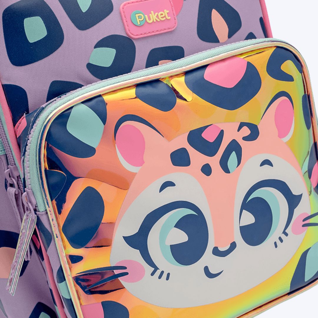 Com um design encantador, a lancheira exibe uma estampa divertida de onçinha e um bolso frontal médio holográfico, trazendo um toque de brilho e modernidade ao visual. O fechamento com zíper é prático e seguro, enquanto as alças de ombro e de mão, ambas ajustáveis, oferecem conforto e facilidade para o transporte.