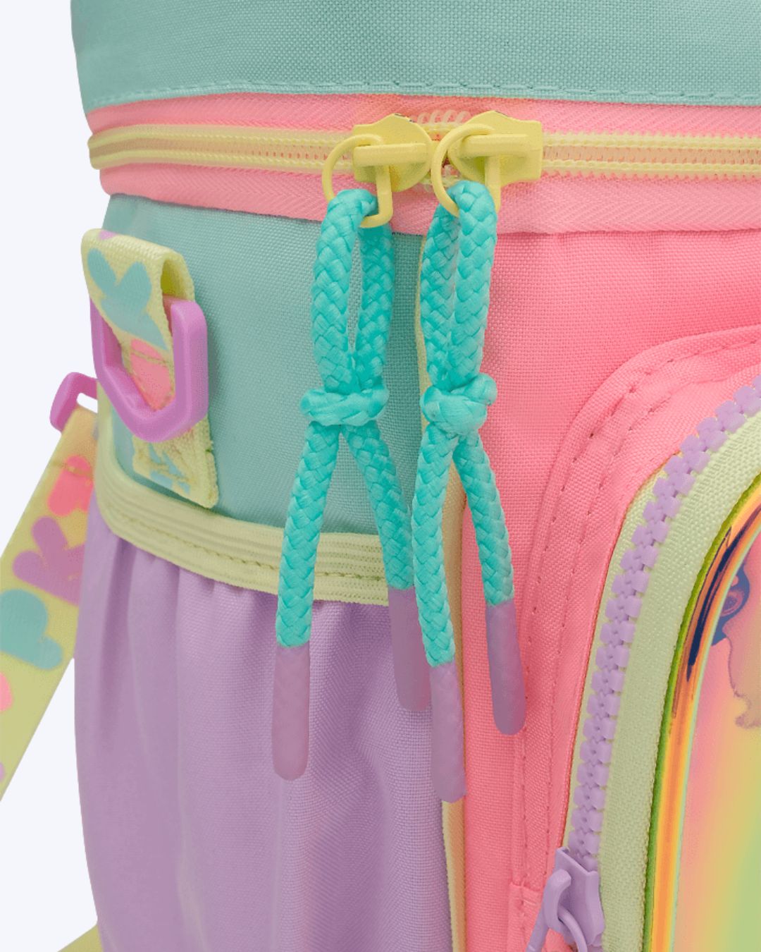 Lancheira Color Block em nylon, sem gel, e com forro térmico. Possui bolso frontal médio em TPU transparente costumizável. Bolso lateral para garrafinha. Alça de mão fixa e alça de ombro com regulagem.