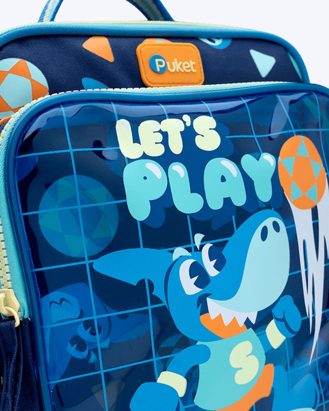 Lancheira em nylon, sem gel, com forro térmico. Possui bolso frontal médio em PVC telado com estampa de tubarão.