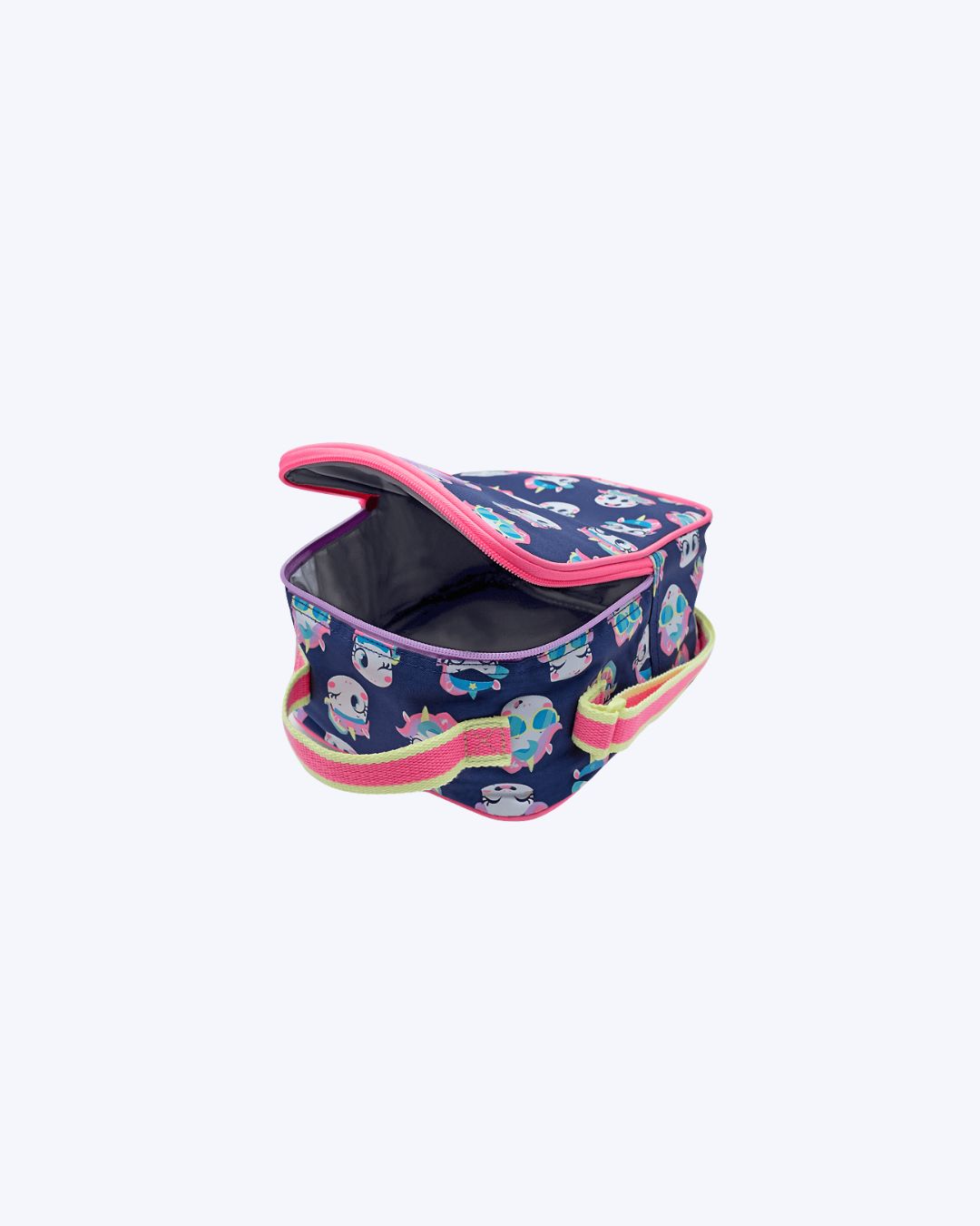 Lancheira térmica estampada de unicórnio. Tamanho: Único Medidas: 19 cm x 24 cm x 10,5 cm (LxAxP) Cor: Marinho Indicado para: Crianças Ocasião: Escolar Material externo: Poliéster (nylon) Material Interno: Poliéster Alças: de ombro e de mão fixa. Fechamento: Com zíper Compartimentos: Compartimento principal