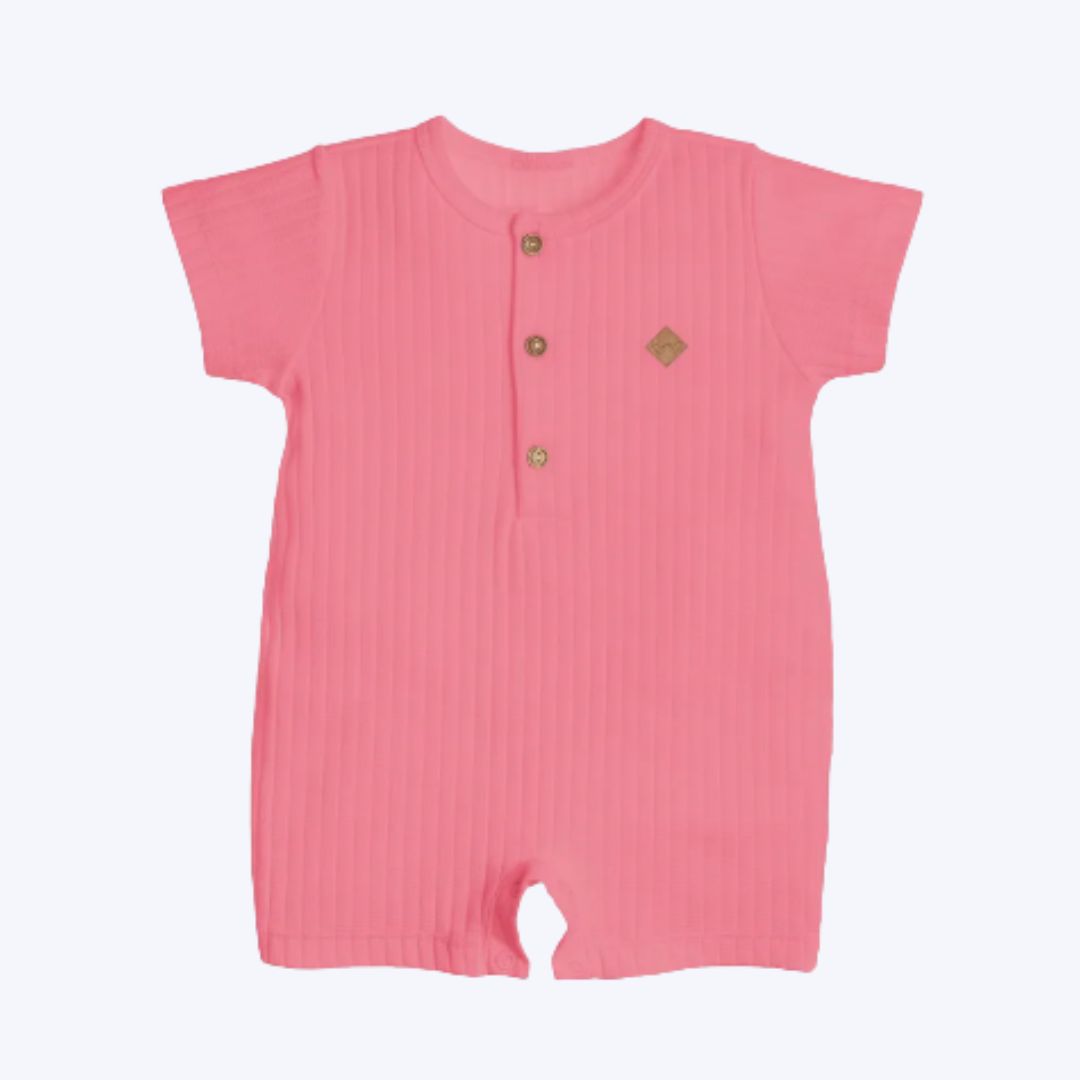 O fechamento com botão na parte frontal do macacão facilita o vestir e a remoção da peça, sem causar desconforto ao bebê e proporcionando uma experiência tranquila para os pais, especialmente durante a troca de fraldas.