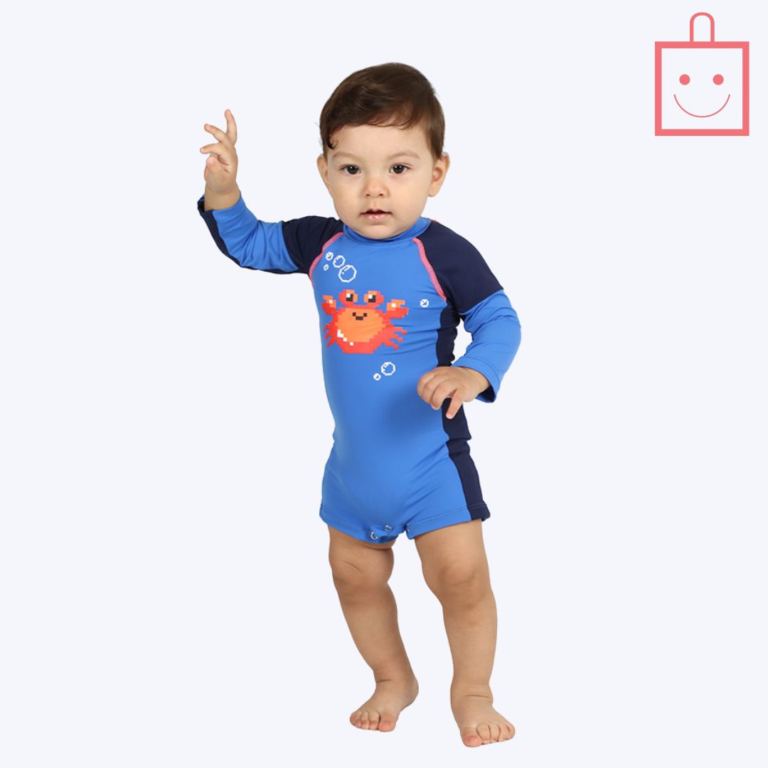 Com uma adorável estampa frontal de siri, o macaquinho traz um toque lúdico e alegre, perfeito para destacar o visual do bebê. O tecido é leve, macio e possui proteção UV50+, proporcionando uma barreira adicional contra os danos causados pelos raios solares, essencial para proteger a pele delicada do seu bebê durante o dia.