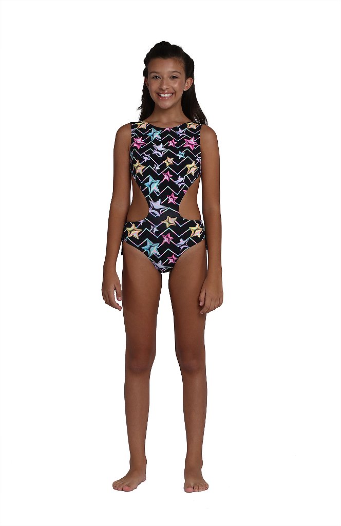 Um modelo para as gatinhas que amam estampas coloridas! O fundo preto destaca as estrelas coloridas, bem como as linhas que atravessam a peça de um lado ao outro. O recorte na cintura deixa a peça com um ar super moderno! Perfeito para um dia de sol curtindo a praia ou piscina!