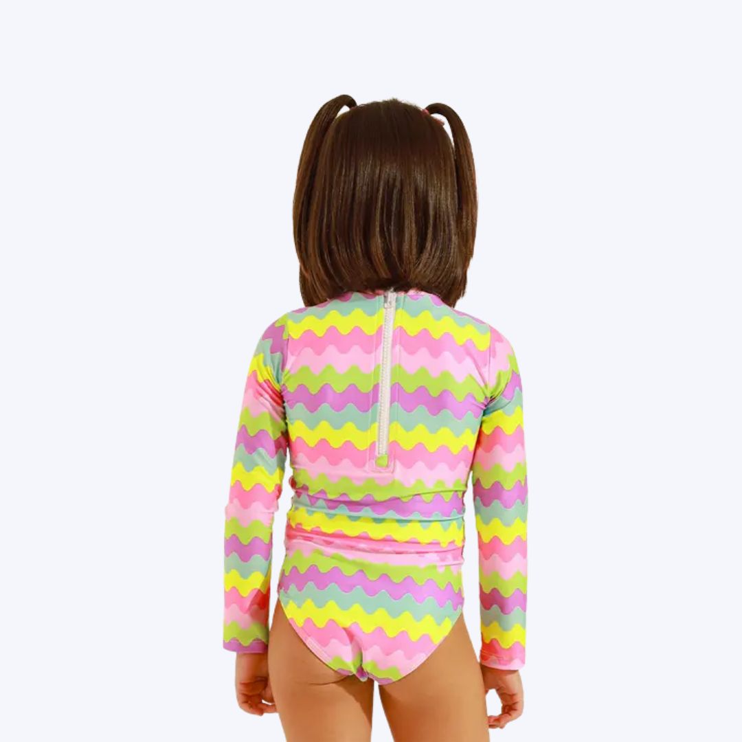 A vibrante estampa colorida de ondas proporciona um visual alegre e único, destacando as meninas na moda praia infantil.