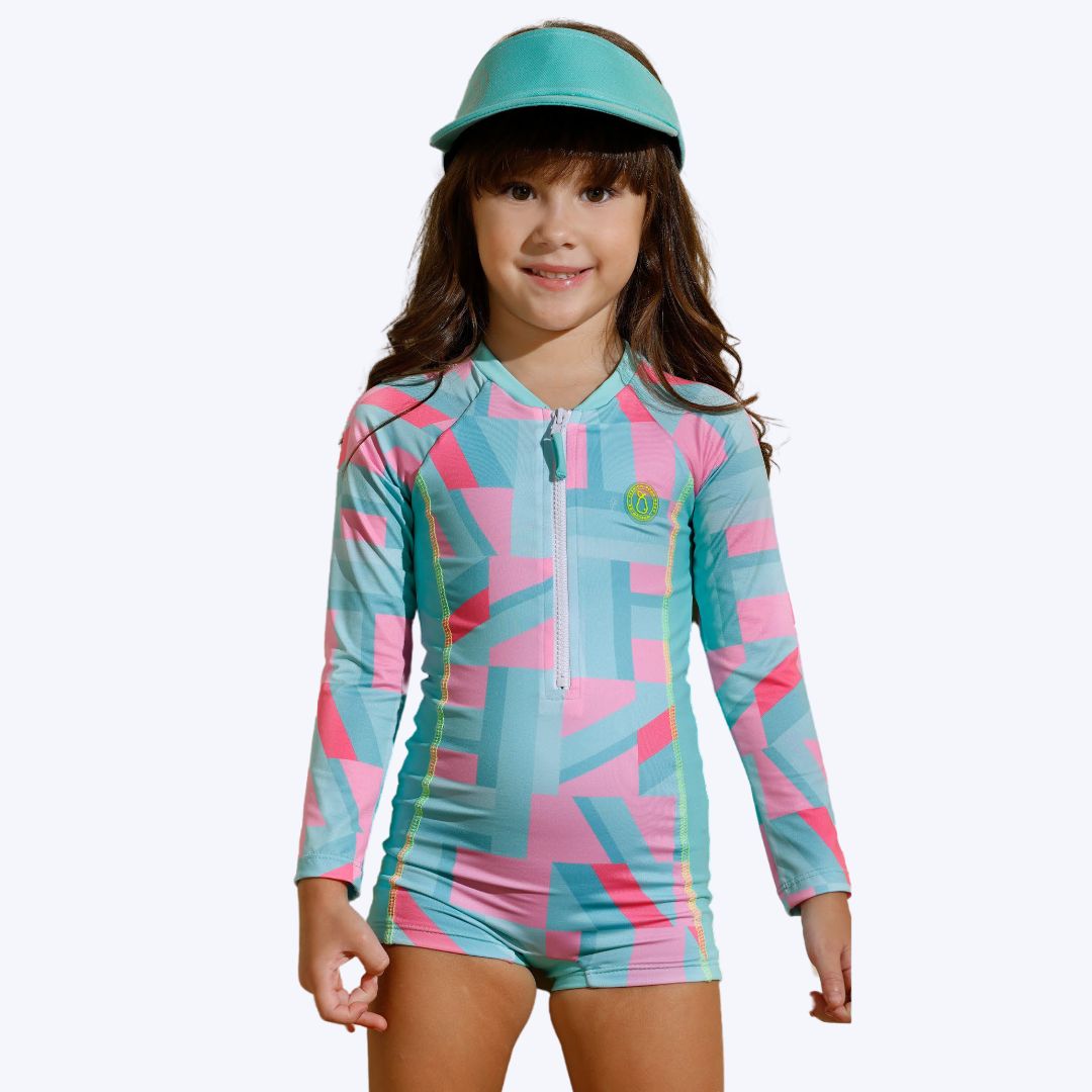Maiô manga longa modelo com shortinho e zíper frontal, estampa lúdica colorida. Nosso maiô infantil azul tifany para pequenas surfistas e nadadoras é uma escolha perfeita para pais que querem ficar tranquilos enquanto as crianças se divertem nos dias de sol à beira da piscina ou na praia. Sua modelagem confortável com mangas longas permite que as pequenas possam aproveitar ao máximo seus momentos de lazer em segurança. O zíper na parte da frente facilita o vestir da peça.