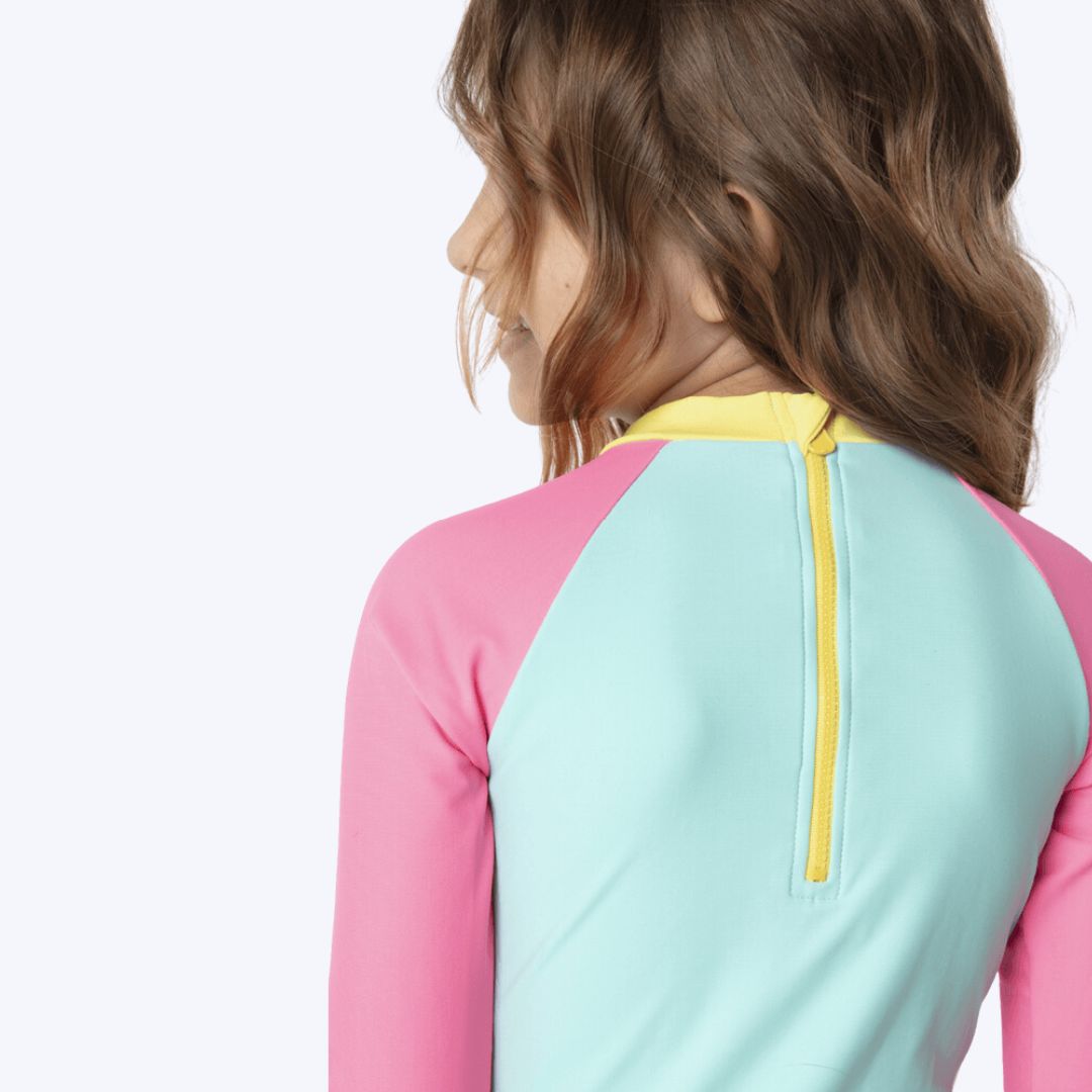 - Design com Manga Longa Raglan: O maiô possui manga longa raglan, proporcionando um ajuste confortável e flexível. O punho aplicado em cor contrastante adiciona um toque moderno e delicado à peça, garantindo um visual encantador e moderno.