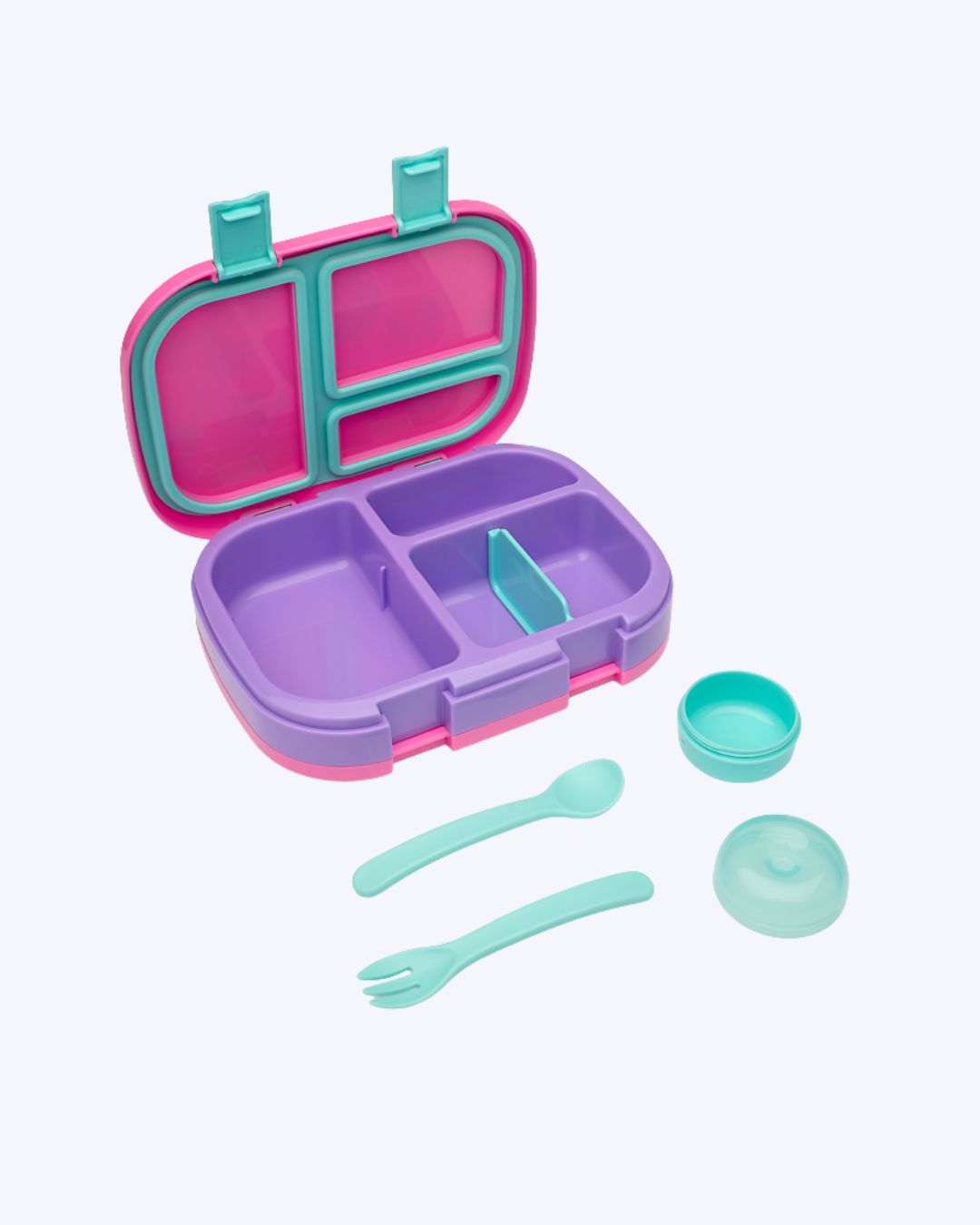 Marmita Grande em formato retangular de borda arredondada, tampa de encaixe com estampa de Multibichos. Acompanha 1 garfo e 1 colher de plástico.