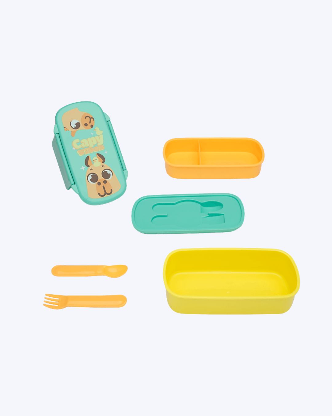 Marmita média em formato retangular de borda arredondada com dois andares, tampa de encaixe com estampa de Capivara. Acompanha 1 garfo e 1 colher de plástico.