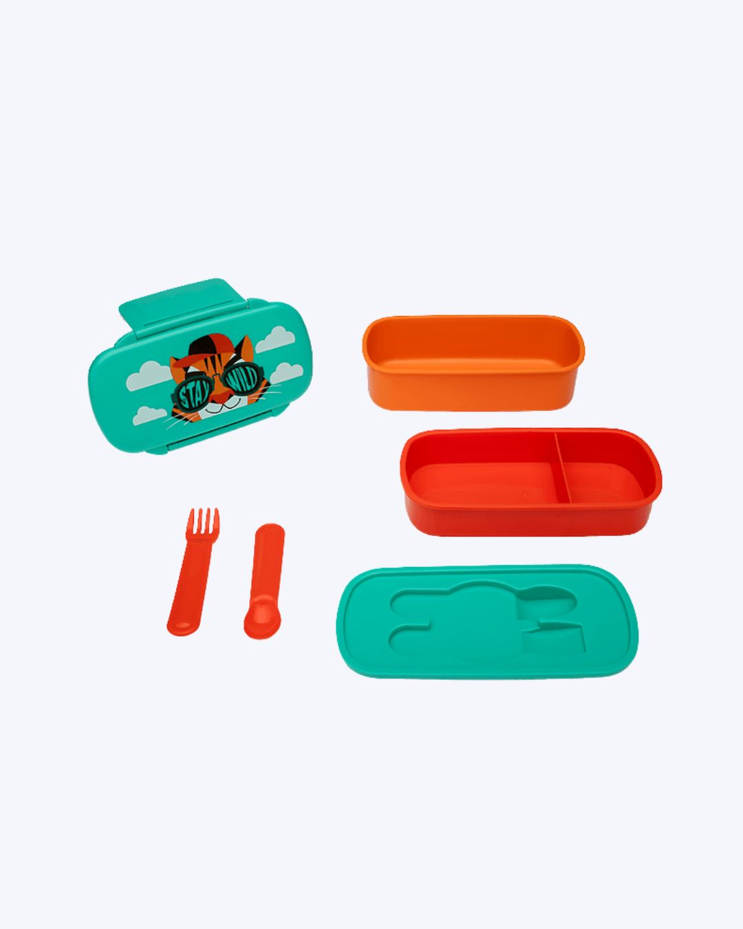 Marmita média em formato retangular de borda arredondada com dois andares, tampa de encaixe com estampa de Tigre. Acompanha 1 garfo e 1 colher de plástico.