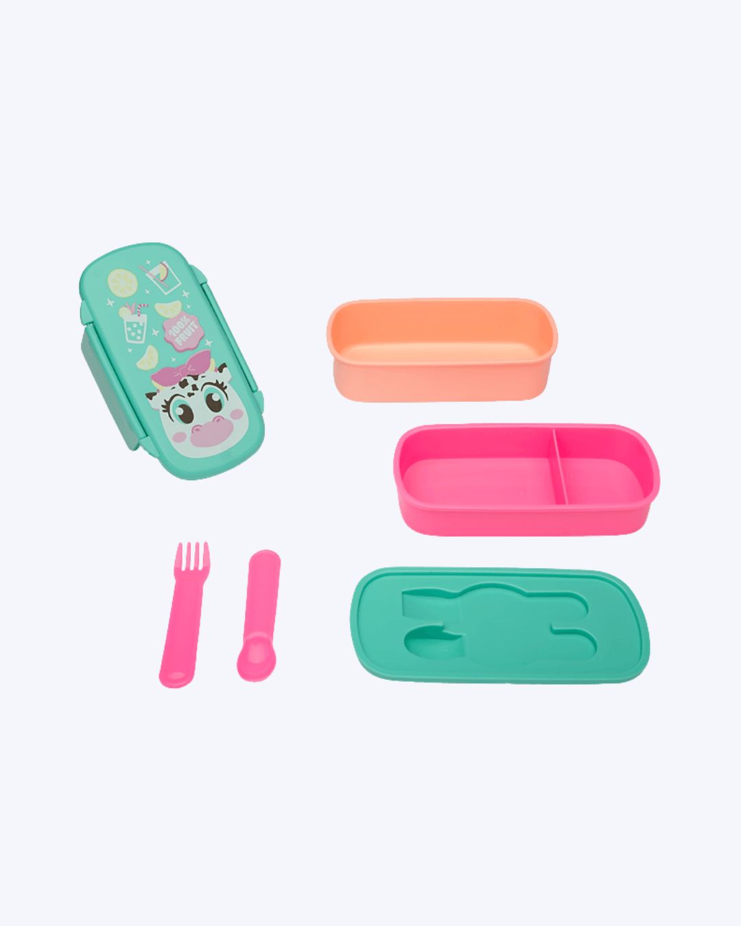 Marmita média em formato retangular de borda arredondada com dois andares, tampa de encaixe com estampa de Vaca. Acompanha 1 garfo e 1 colher de plástico.