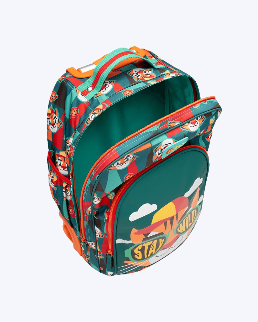 Mochila em nylon com rodinha e estampa corrida de Tigre. Bolso frontal médio em PU fosco, bolsinho lateral pra garrrafinha, alça de mão e puxador com duas alturas de regulagem.