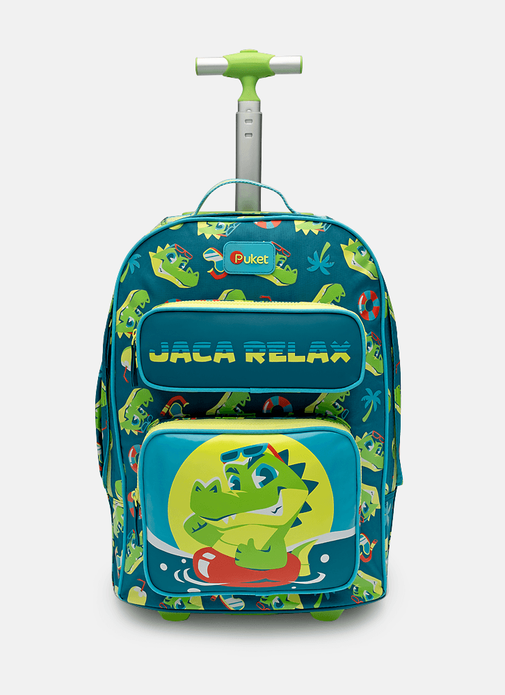 Mochila em nylon com rodinha. Bolsos frontais em PU fosco com estampa de Jacaré, alça de mão e puxador com duas alturas de regulagem.