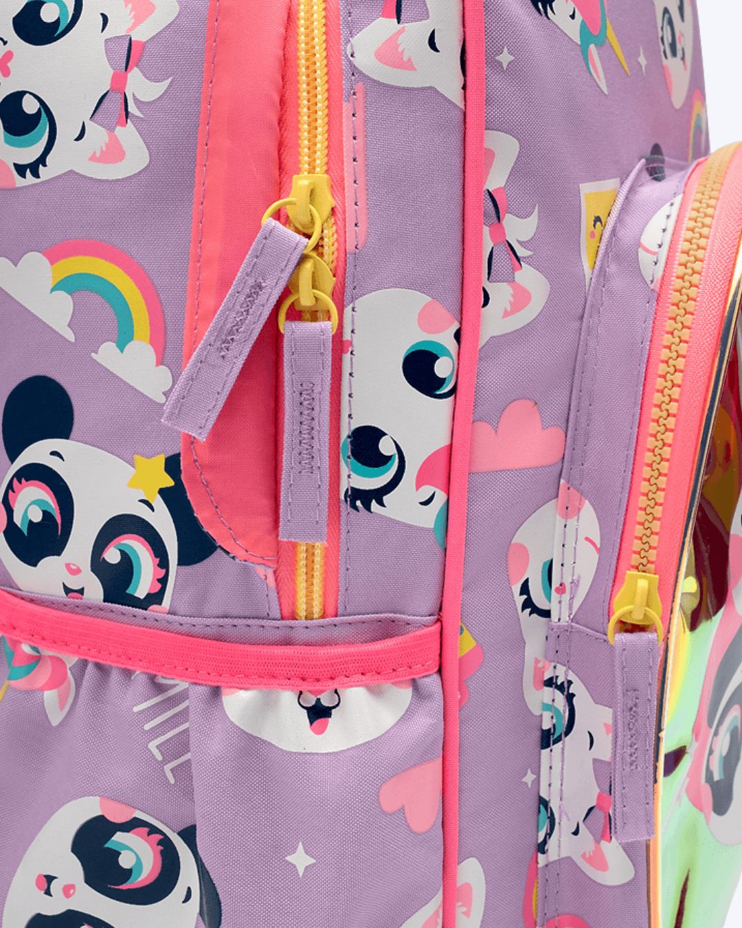 Mochila em nylon com rodinha. Bolso frontal pequeno em TPU holográfico com estampa de de multibichos, alça de mão e puxador com duas alturas de regulagem.