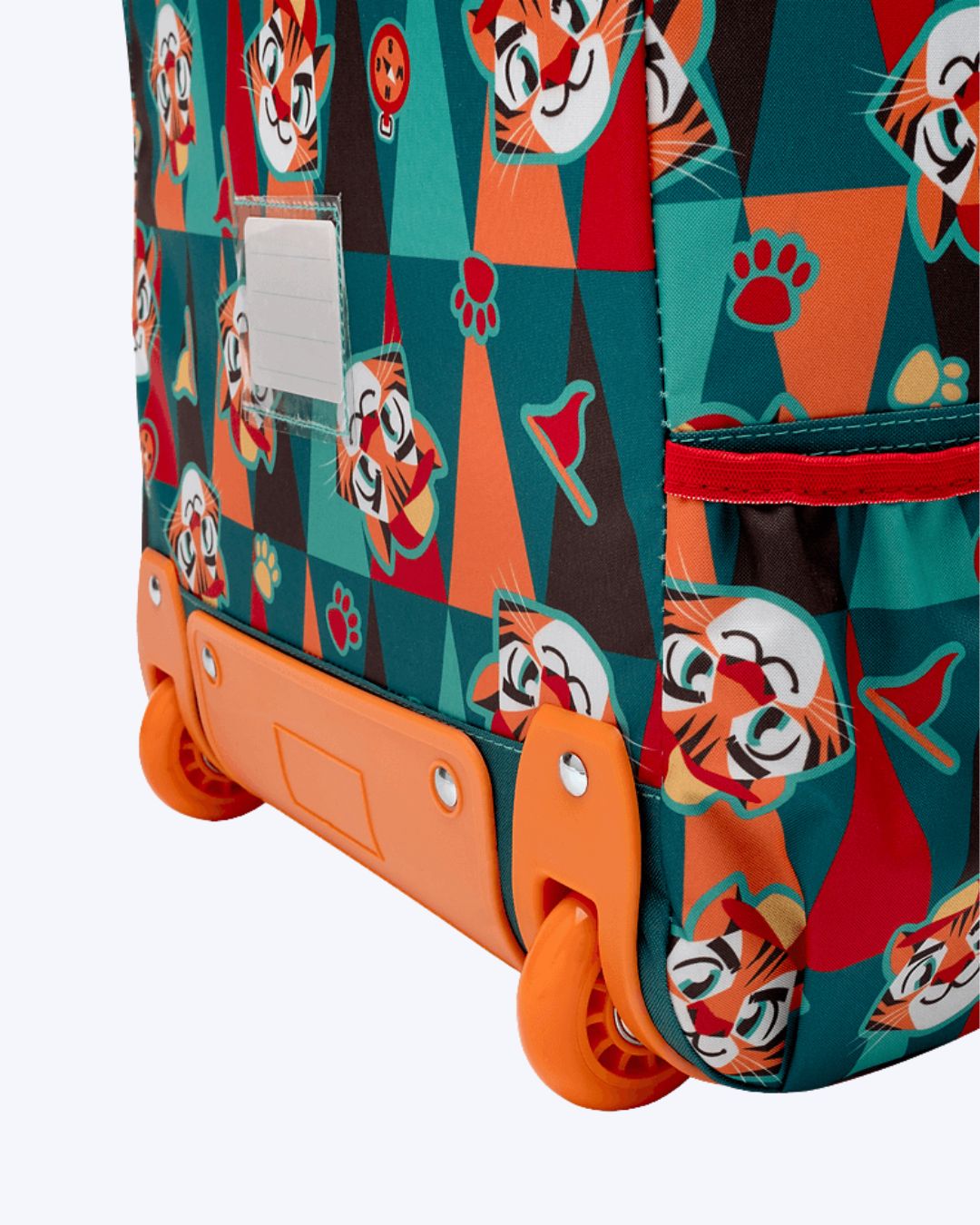 Mochila em nylon com rodinha. Bolso frontal pequeno em PU fosco com estampa de Tigre, alça de mão e puxador com duas alturas de regulagem.
