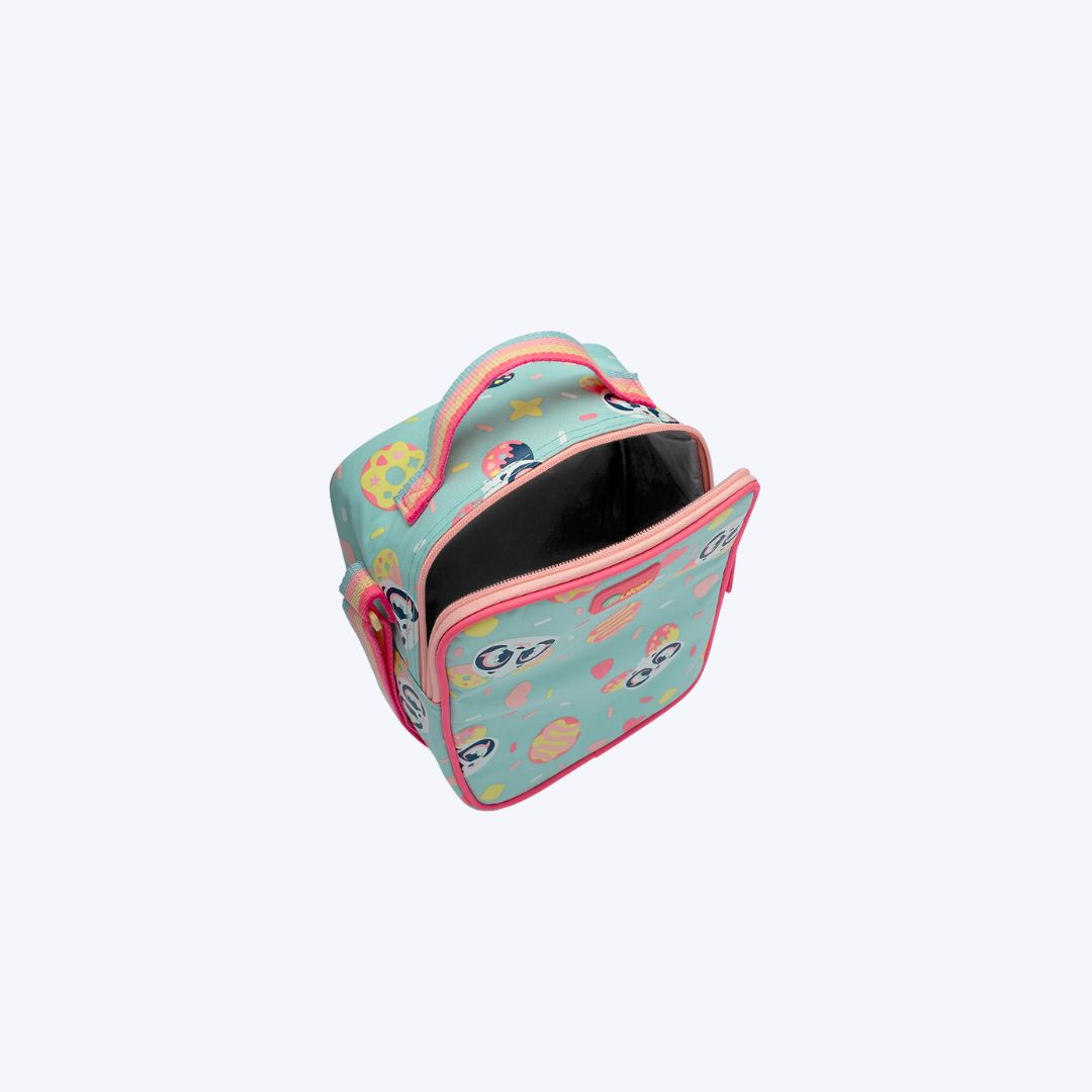 Mochila em nylon com rodinha e lancheira, ambas em estampa corrida. Mochila com alça de mão e puxador com duas alturas de regulagem.