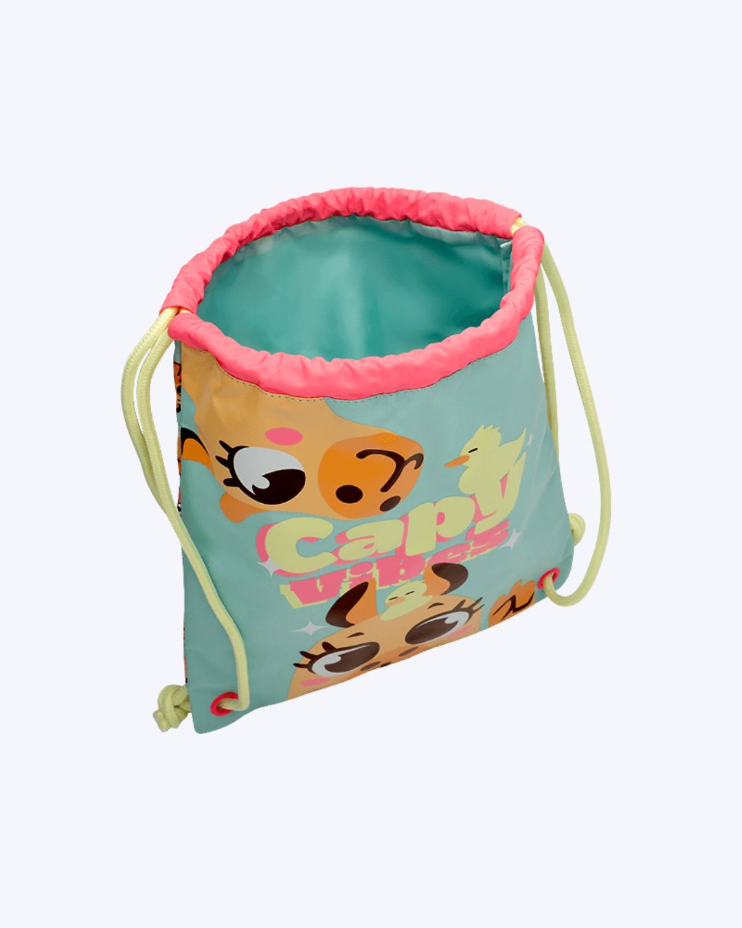 Mochila saquinho em nylon com estampa de capivara. Possui fechamento por meio das alças coloridas e reguláveis.