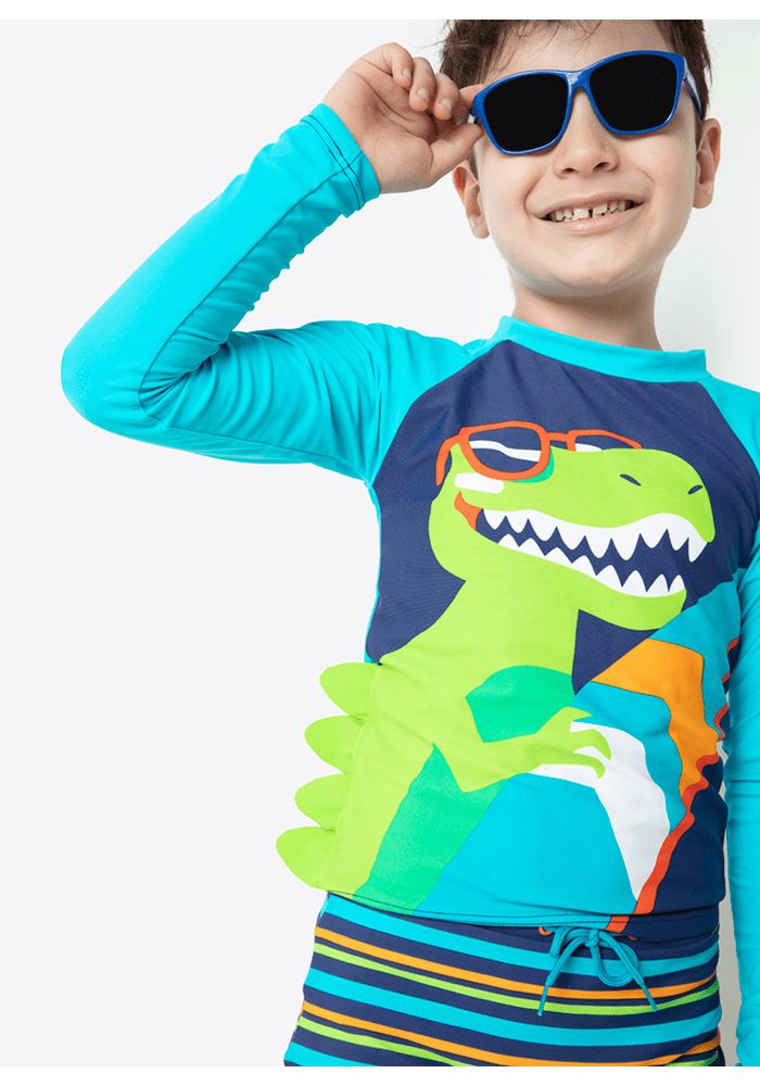 Conjunto moda praia da marca Puket com camiseta proteção UV de dinossauro. Sunga box listrada com elástico no cós.