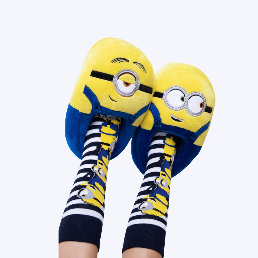 Pantufa Minions com detalhe bordado, aplique de tecido metalizado nos óculos. Pé direito do Bob e pé esquerdo do Stuart. Indicado para crianças a partir de 3 anos Tecido interno e externo em pelúcia de poliéster macio, solado em espuma firme e enchimento sintético. Sola antiderrapante