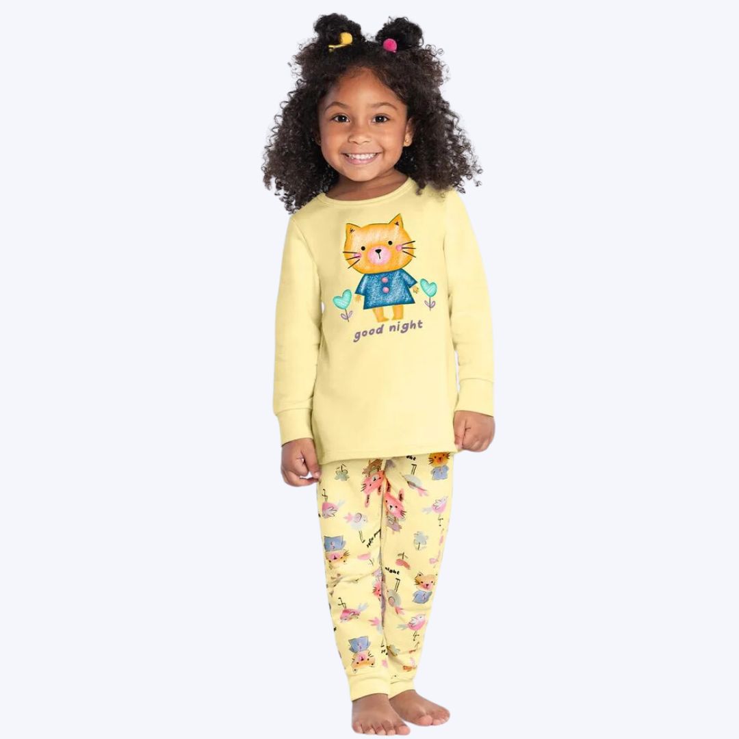 A calça complementa o conjunto com uma estampa rotativa de gatinhos e coelhinhos, proporcionando um visual charmoso e delicado. Possui cintura com elástico rebatido para um ajuste perfeito e punhos com acabamento em debrum, garantindo praticidade e conforto durante toda a noite.