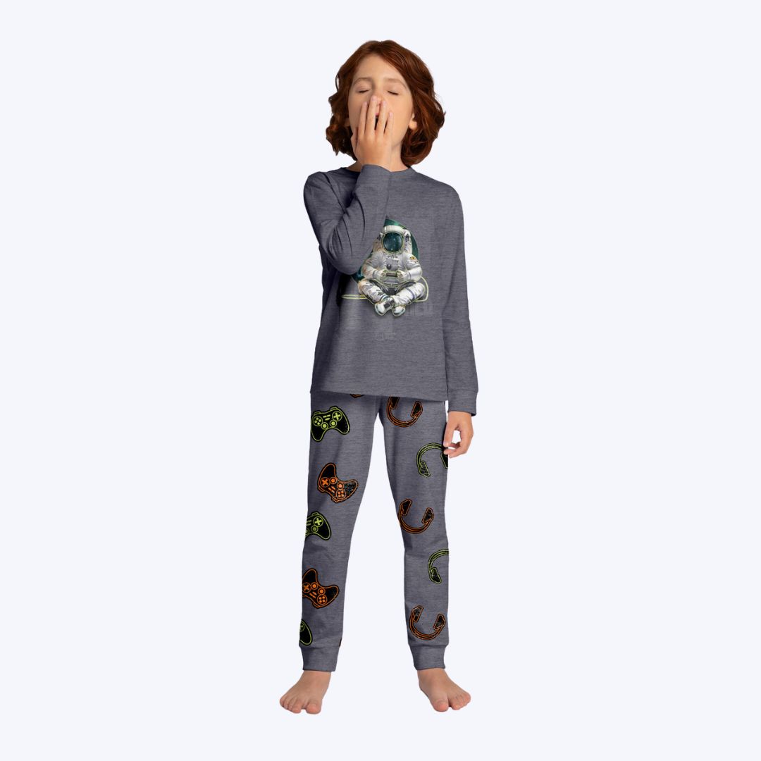 Confeccionado em meia malha 100% algodão, o pijama é composto por blusa de manga longa e calça com elástico na cintura, proporcionando um caimento confortável, ideal para noites de sono tranquilas e cheias de sonhos espaciais.