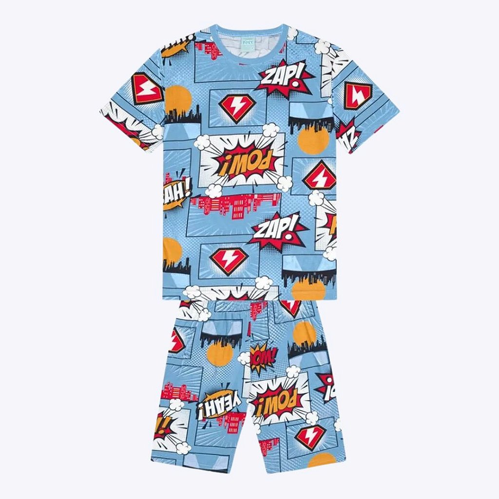 - Design Inspirado em Quadrinhos: A camiseta do pijama exibe uma estampa rotativa vibrante com efeitos gráficos e onomatopeias de quadrinhos, como "POW!" e "BANG!", que capturam a essência dos heróis e aventuras das histórias em quadrinhos. Este design dinâmico estimula a imaginação e torna a hora de dormir mais empolgante para os pequenos.