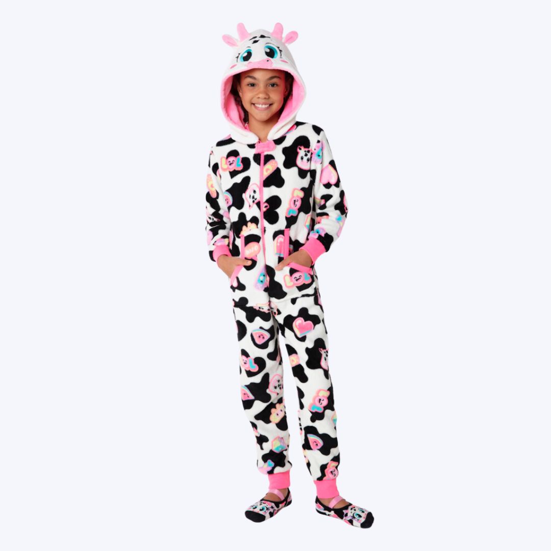 Macacão branco em coral fleece com estampa de vaca com capuz. Possui toque macio devido à sua característica felpuda, o que torna o pijama super quentinho e confortável. Ideal para aconchegar nas noites frias.