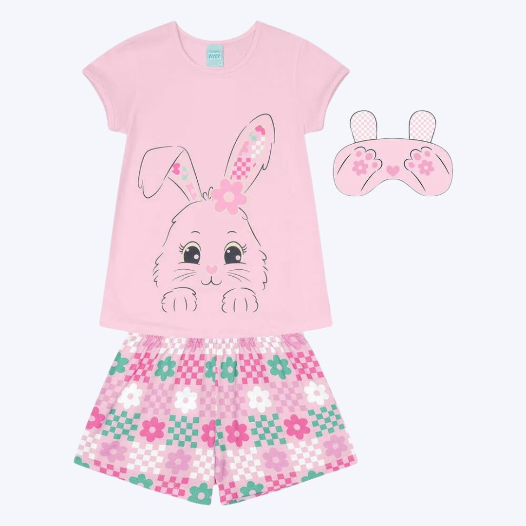 Para tornar a experiência ainda mais encantadora, o pijama acompanha uma máscara de dormir em formato de coelhinho, com olhos e orelhas que imitam a estampa da blusa, proporcionando um toque de fofura extra e ajudando a criar um ambiente relaxante para um sono reparador.