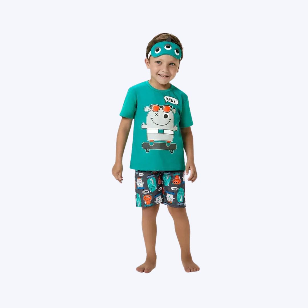 Este pijama infantil Kyly une diversão, estilo e carinho em uma única peça, ideal para o uso diário dos meninos. O design criativo com o monstrinho skatista e a estampa rotativa da bermuda criam um visual alegre e estimulante para as crianças. Acompanha uma máscara de dormir que adiciona um toque extra de charme e auxilia na rotina noturna.