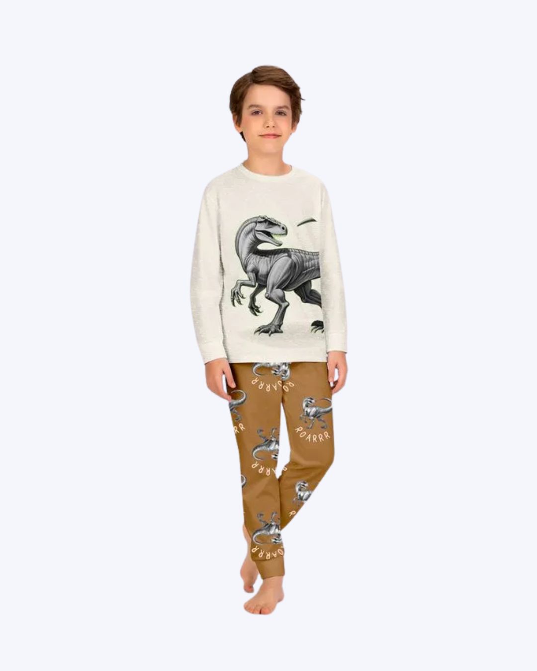 O conjunto apresenta uma camiseta com estampa localizada de dinossauro e uma calça com estampa rotativa de dinossauros e lettering, criando um visual completo e harmonioso.