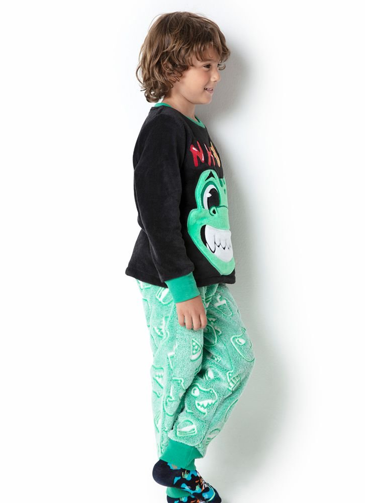 Nome: Pijama Soft Super Quentinho Infantil Masculino Dinossauro Brilha no Escuro Puket