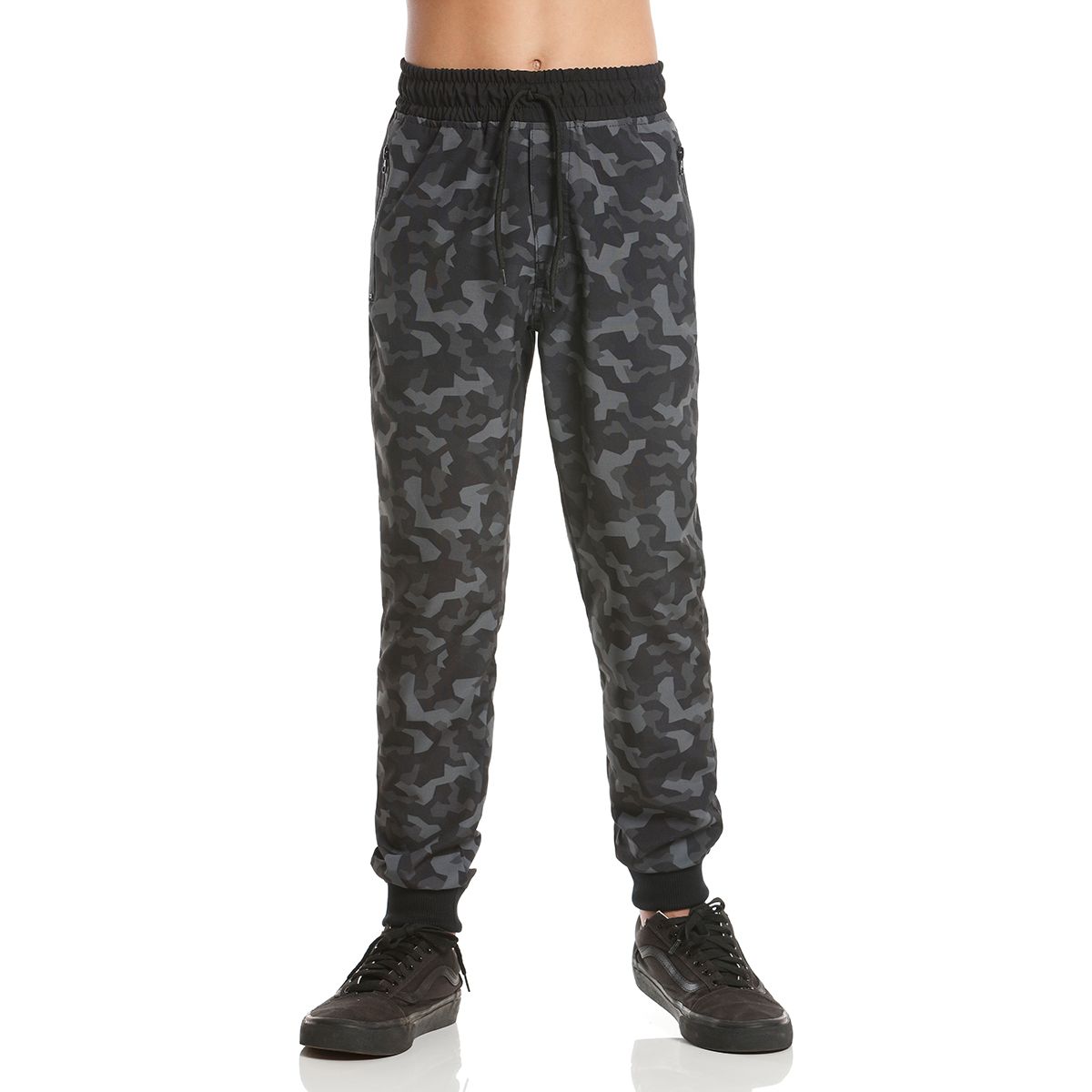 Calça de Moletom Infantil super estilosa com elastico na cintura, cordão para amarrar, modelo com bolsos, e estampa camuflada de exercito nas cores escuras puxando mais para preto.
